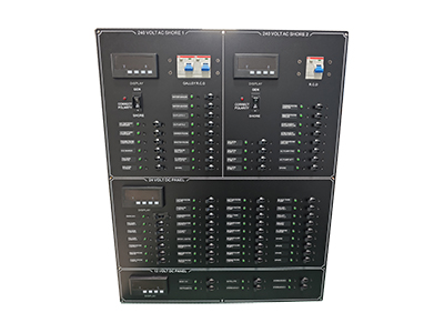 本产品是一款集成化的电源管理控制面板,具备交流与直流电源输入、显示与监控功能,适用于船舶、房车等移动或固定场所的电力系统管理。面板支持240V交流岸电输入、发电机供电、极性检测,并提供24V与12V直流电源输出,方便多种设备供电。
